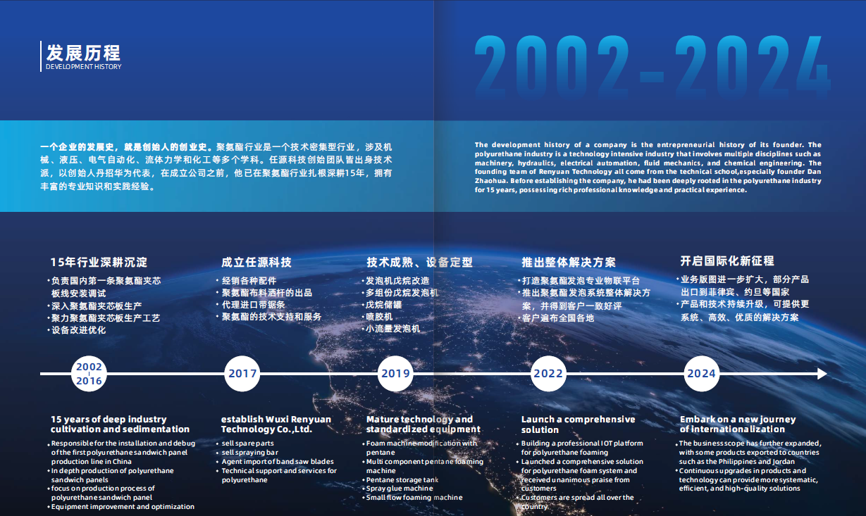 无锡市任源科技有限公司成立于2017年,是一家专注聚氨酯发泡技术的创新型科技企业,集研发、生产、销售和技术服务为一体,在连续线夹芯板发泡机领域居于行业领先地位。