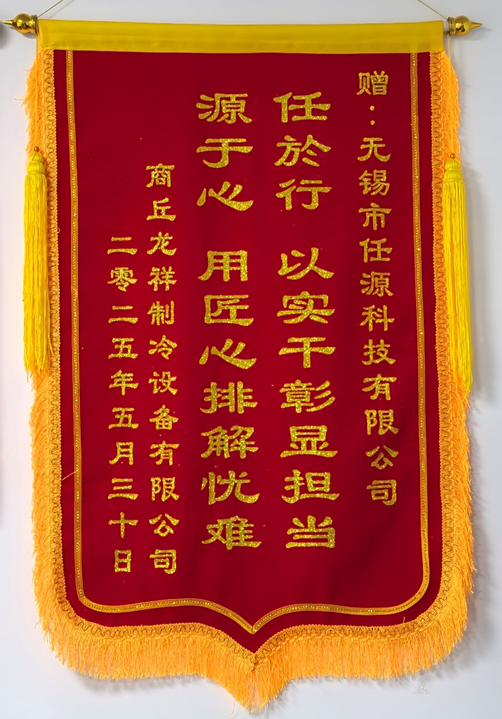 近日,无锡市任源科技有限公司收到了来自商丘龙祥制冷设备有限公司的一面饱含诚意的锦旗,鲜红的锦缎上 “任于行以实干彰显担当,源于心用匠心排解忧难” 的金色大字熠熠生辉,既是对任源科技专业服务的高度认可,更是双方合作互信的生动见证。